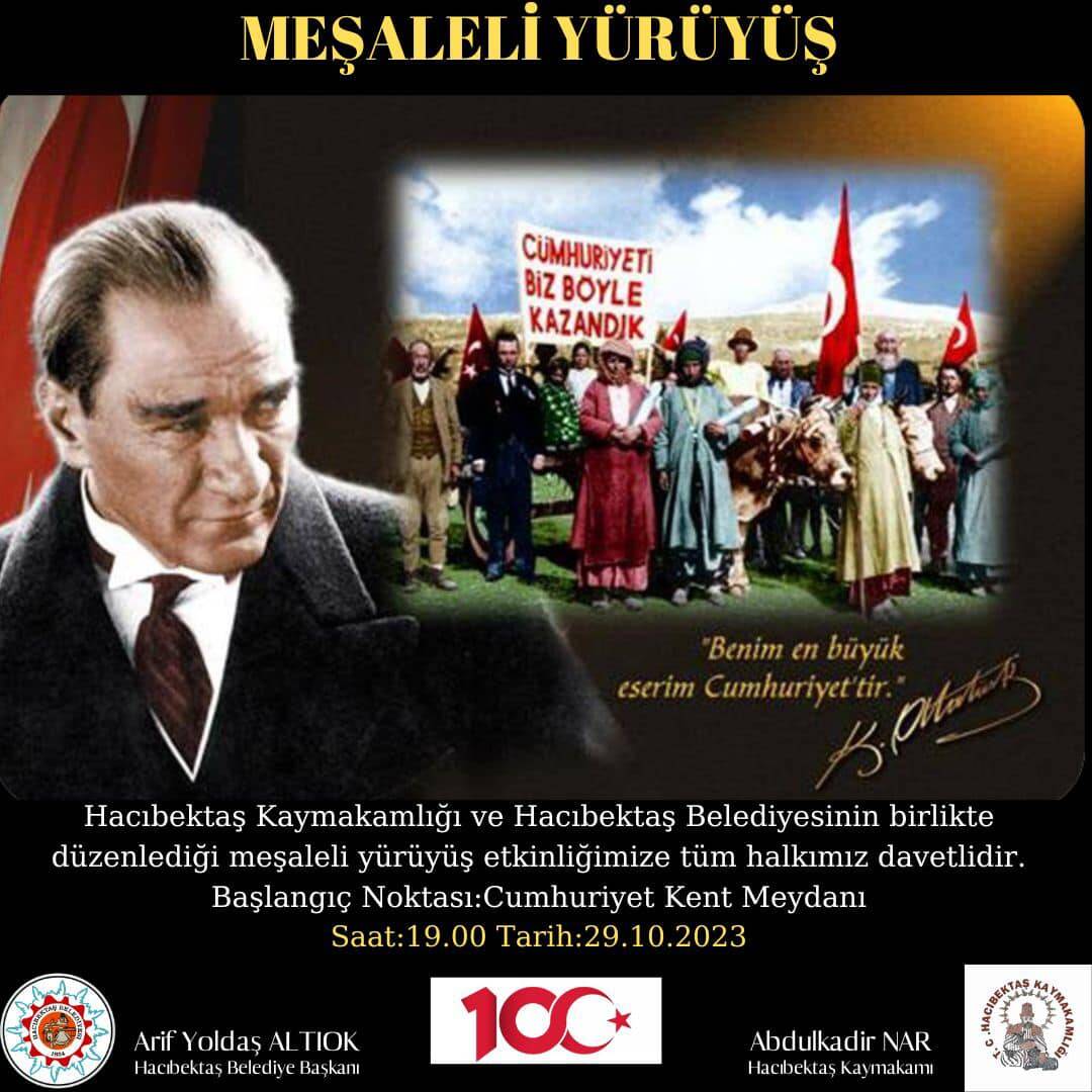 29 Ekim 2023 Pazar günü Cumhuriyetimizin 100. yılı münasebetiyle Hacıbektaş Kaymakamlığı ve Hacıbektaş Belediyesinin koordinasyonunda düzenlenecek olan fener alayı (meşaleli yürüyüş) etkinliğine Yüksekokulumuz olarak katılacağız. Katılım sağlamak isteyen öğrenciler; öğrenci temsilcimiz Fatih GÖNÜLKIRMAZ ve müdür yardımcımız Öğr.Gör. Ensar KOŞATEPE ile iletişim kurabilirler.